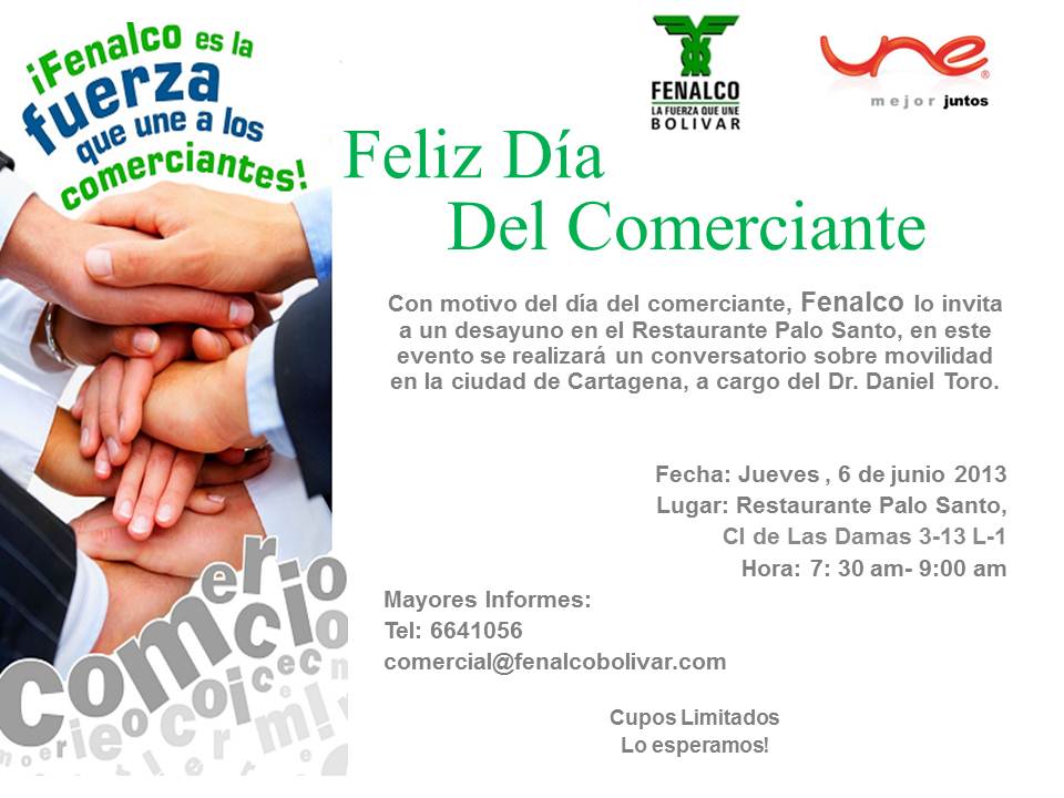 Con motivo del día del comerciante, Fenalco lo invita a un desayuno en el Restaurante Palo Santo, en este evento se realizará un conversatorio sobre movilidad en la ciudad de Cartagena, a cargo del Dr. Daniel Toro.