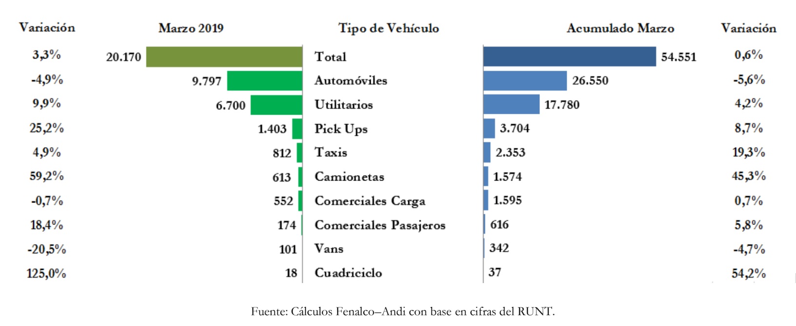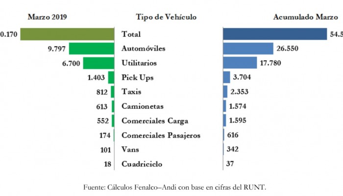 El total de matrículas del sector automotor en el mes de marzo de 2019 fue de 20.170 vehículos, que representaron un crecimiento de 3.3 % respecto al mismo mes del año anterior cuando se matricularon 19.543 unidades. En lo corrido del año se destacaron los segmentos de “cuadriciclos y camionetas” al registrar crecimientos del orden del 54.2 % y 45.3 % frente al año anterior.
